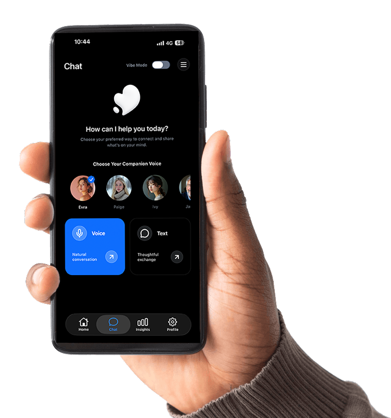 Evra is your always-available emotional companion - offering calm, supportive conversations through chat or voice, anytime you need it.